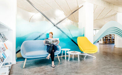 Con referencias a las olas del océano, hemos creado una biblioteca que establece un marco para situaciones de aprendizaje diferenciadas. Los usuarios de la biblioteca pueden sumergirse en un ‘océano’ de libros en los relajantes entornos del Mar. Los más jóvenes pueden pasar el tiempo con iPads o libros en las Dunas, mientras que otros hacen los deberes en los lugares de estudio del Jardín.