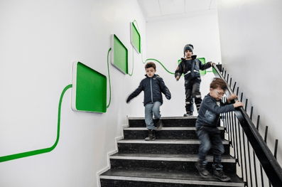 Con colores, gráficos y módulos de diseño personalizado, hemos transformado el sótano – que solía ser un área de tránsito inutilizada – en un nuevo espacio multifuncional para aprender y socializar.
