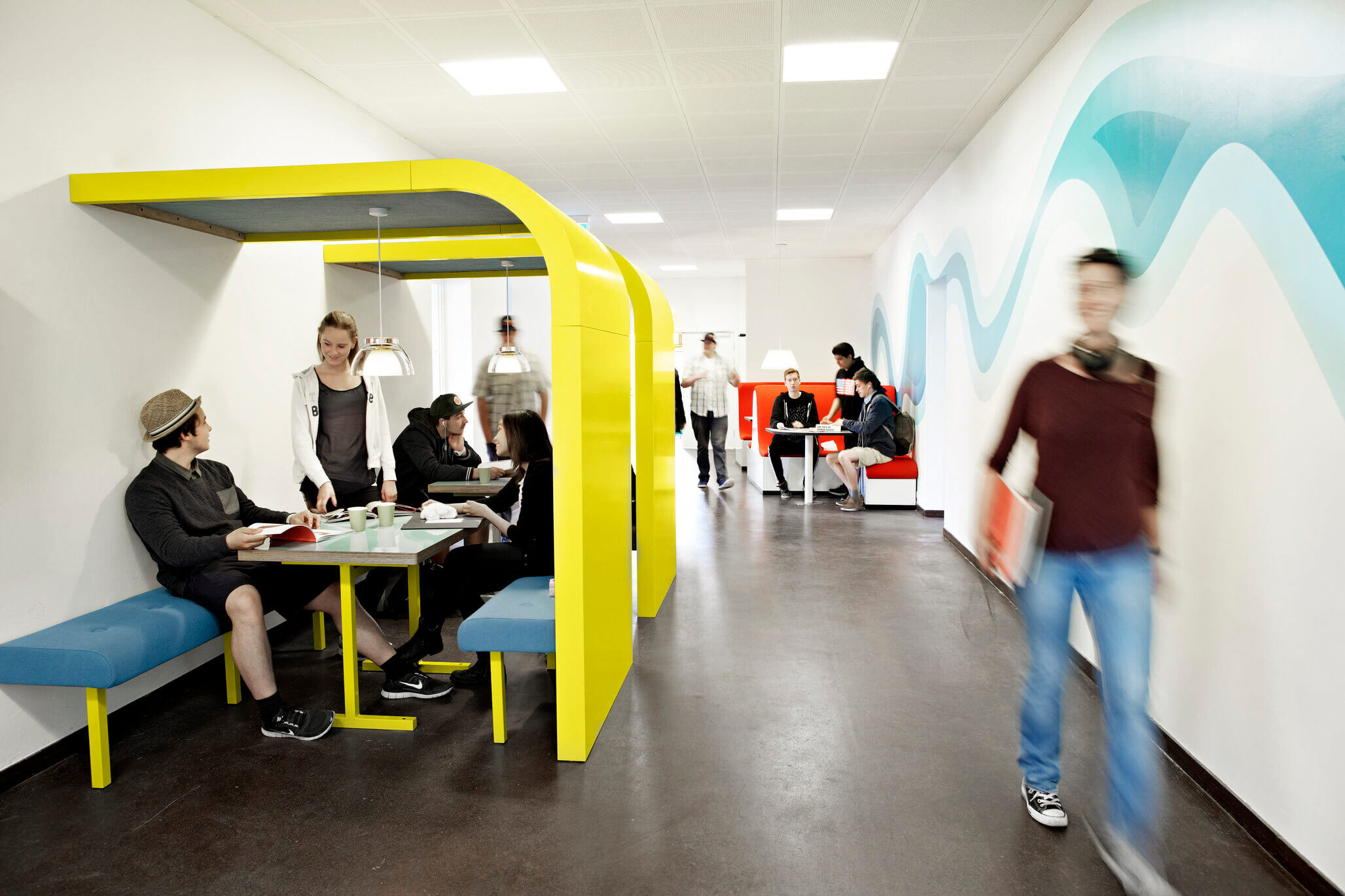 Los muros se han activado con colores y gráficos que dan identidad al campus. Mesas altas, zonas de descanso modulares y casetas a lo largo de los muros dejan espacio a los encuentros informales y al trabajo en grupo: ya sea sentados, tirados al suelo o de pie.