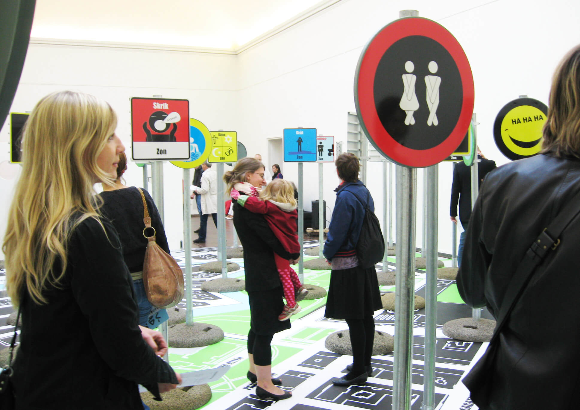 Aunque son similares a señales de tráfico tradicionales, estas señales invitan a acciones poco tradicionales. En el suelo, una marca blanca indica una “zona libre” donde está permitido olvidarse de los estándares sociales y utilizar el espacio urbano de maneras distintas.