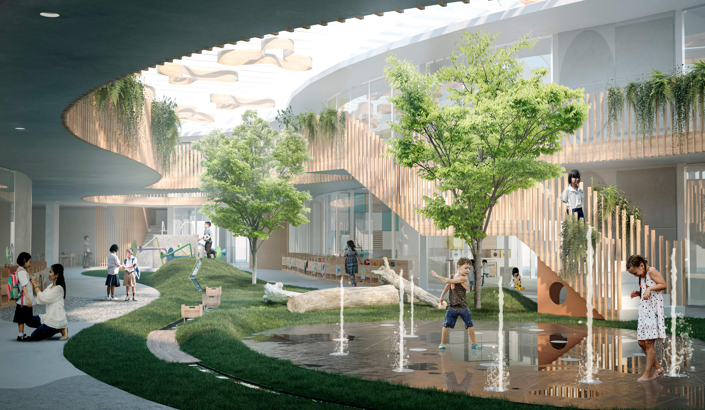 Con el objetivo de despertar la curiosidad innata de los estudiantes, la exuberante naturaleza de Tailandia se entrama en el concepto de diseño creado por Rosan Bosch Studio y los colaboradores locales. Los alumnos se embarcarán en un trayecto de descubrimiento y exploración, con tres vías de aprendizaje principales que conectarán a los estudiantes en comunidades dedicadas a las artes, los deportes y las ciencias. El entorno físico se organiza en torno a jardines de aprendizaje diferenciados, cuidadosamente seleccionados para apoyar el crecimiento natural en el proceso de aprendizaje.