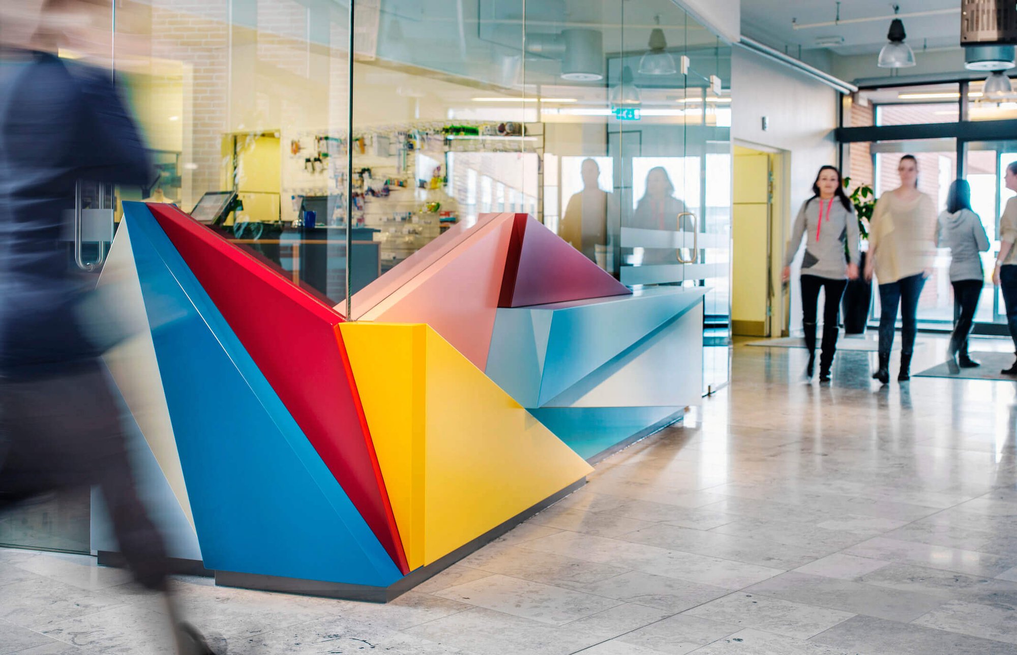 Con un conjunto de islas de colores, nuestro diseño interviene en los flujos de movimiento en el área común del Campus Viborg de la Universidad VIA. El interior constituye un entorno de aprendizaje motivador, donde los estudiantes pueden desarrollarse y cultivar sus estudios diarios.
