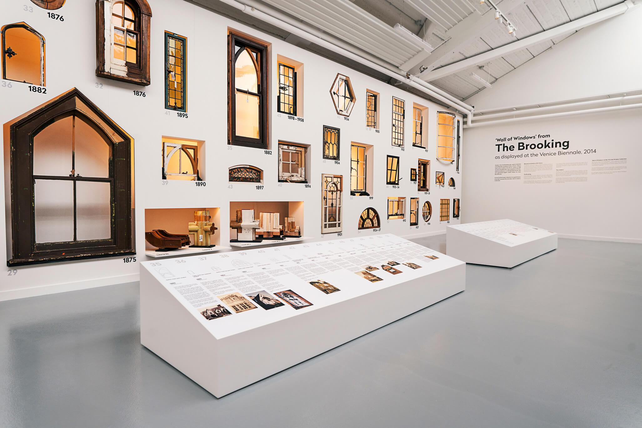 Con el diseño de la Wall of Windows, utilizamos el espacio oblongo como una galería cronológica. Hemos añadido podios expositivos en el área expositiva, que presentan el extenso conocimiento de Charles Brooking sobre el patrimonio constructivo y los sofisticados mecanismos de las ventanas.