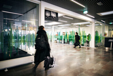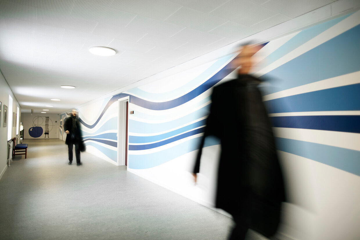 With graphic elements in the wallpaper and collages, the institution's many spatial modules link together and create identity markers for the different field of studies.