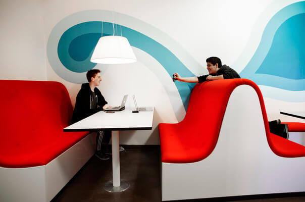 Tall red trees rise among the tables in the common area and provide a unique spatial experience and signature for the college – as reminders of nature's growth.