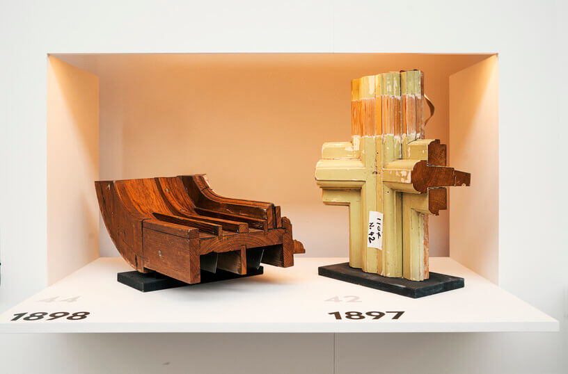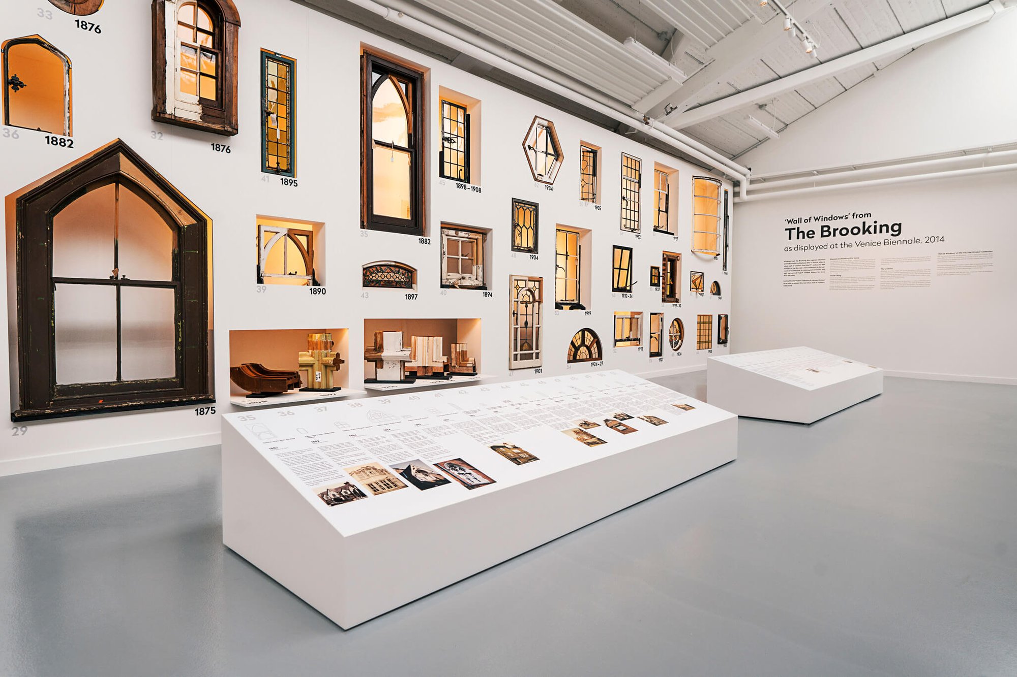 The design of Wall of Windows utilize the oblong showroom as a chronological gallery. We have brought out the exhibition podiums, so they present Charles Brooking's knowledge of craftsmanship and built heritage.